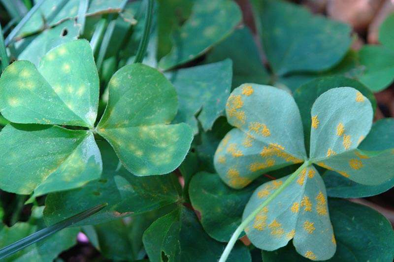Rust: This fungal disease earned its name from the rust-orange pustules that form on the undersides of leaves. The fungus grows and spreads, upper leaf surfaces discolor, and leaves eventually fall from the plant. Cool, moist weather and wet foliage fuels rust as it spreads with the help of wind, water and unwitting insects.