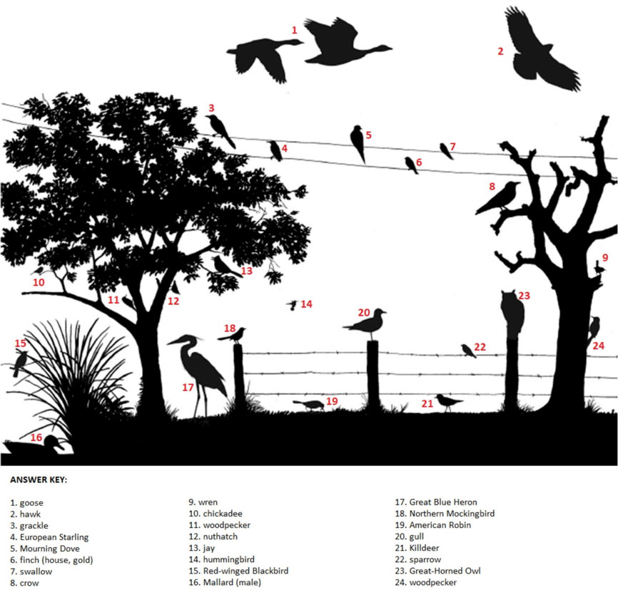 Now that you’ve learned a bit more about bird habitats and silhouettes, see if you can identify some (or all) of the bird species in the image below, before looking at the answer key. The printable version of the silhouette image is available for download on BirdSleuth’s page, which is also used in their Teaching Bird ID article: