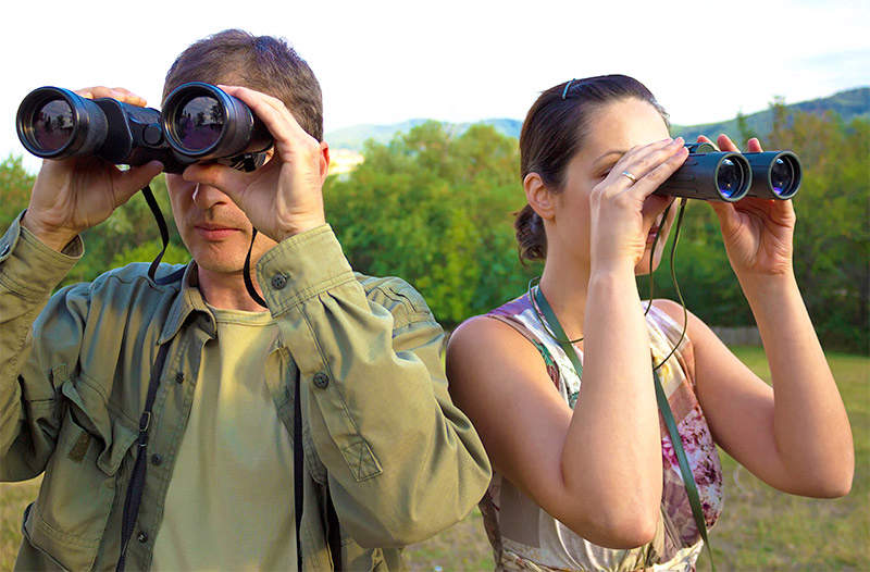 Practice using binoculars on stationary objects so you’re quick at getting them on different-sized things. Keep your eyes on the object—don’t look at your binoculars as you pull them up. This will make it easier when you’re trying to see a tiny, distant bird.