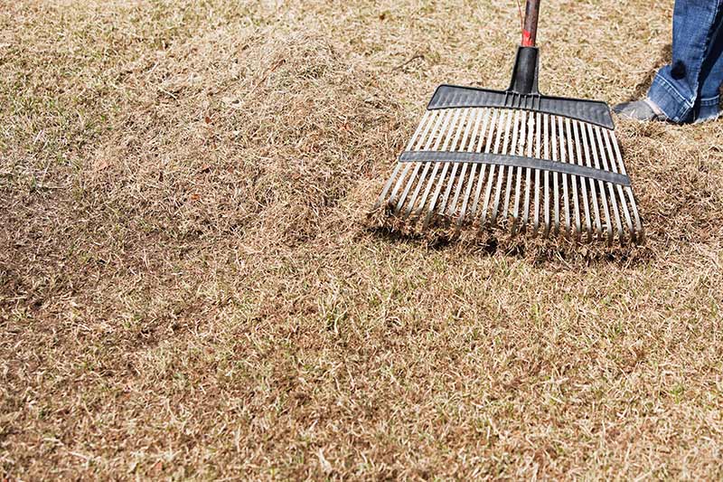 With weeds eliminated, mow your grass to 1 inch tall; then rake to remove any dead grass or debris. Raking loosens and bares soil so it's ready for the next step. Short-tined metal rakes, called garden or bow rakes, work best.