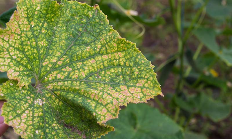 Leaf spot colors differ depending on the fungal pathogens involved. White spots on cucumbers and zucchini squash point to powdery mildew, while yellow spots can be byproducts of downy mildew. Black spots on rose leaves suggest black spot disease, which only affects roses. Brown spots on hydrangea leaves may indicate Cercospora leaf spot, while tomatoes with yellow and brown leaf spots can signal Septoria leaf spot has hit.