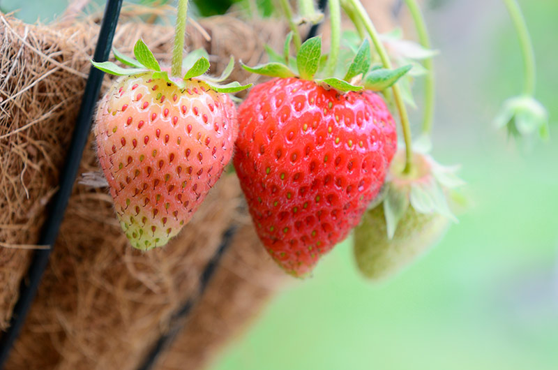 Strawberry plants grow well in hanging baskets, pots and outdoors.