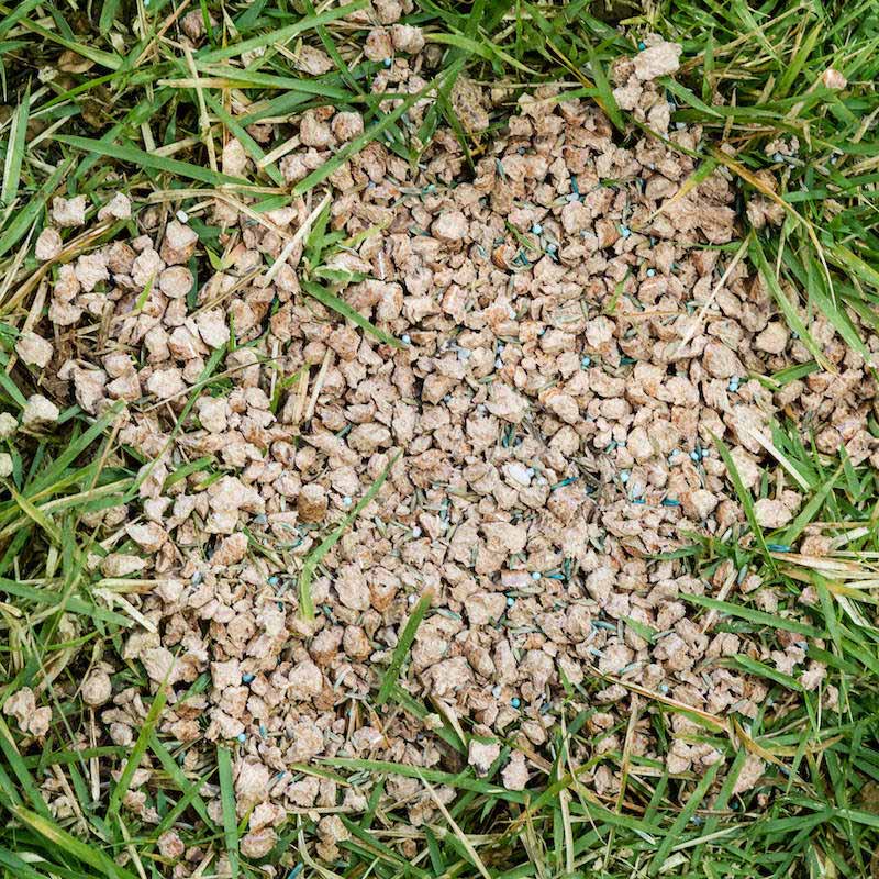 - Water the area well. As you water, watch the wood mulch in this super-absorbent mix turn darker in color. That visual cue signals grass seed has the moisture it needs.