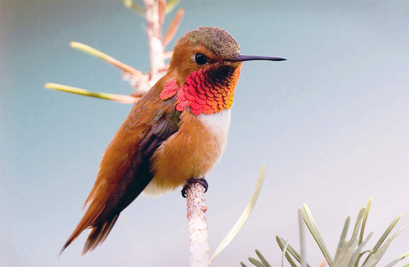 Their most brilliant colors, such as ruby and magenta, are as flashy as gemstones because they are iridescent. There is no ruby or magenta pigment in the natural world. The pigment in the most brilliant feathers is a dull blackish-brown. The feathers show their brilliance when light hits them from a specific direction. This makes them literally flashy—because hummingbirds are so active and inquisitive, they never hold still even when perched, looking every which way, and so as the angle of light changes, their throat color flashes brilliance. This kind of color is called “structural,” because it’s caused by how the cells are arranged in the feathers rather than by an underlying pigment color.