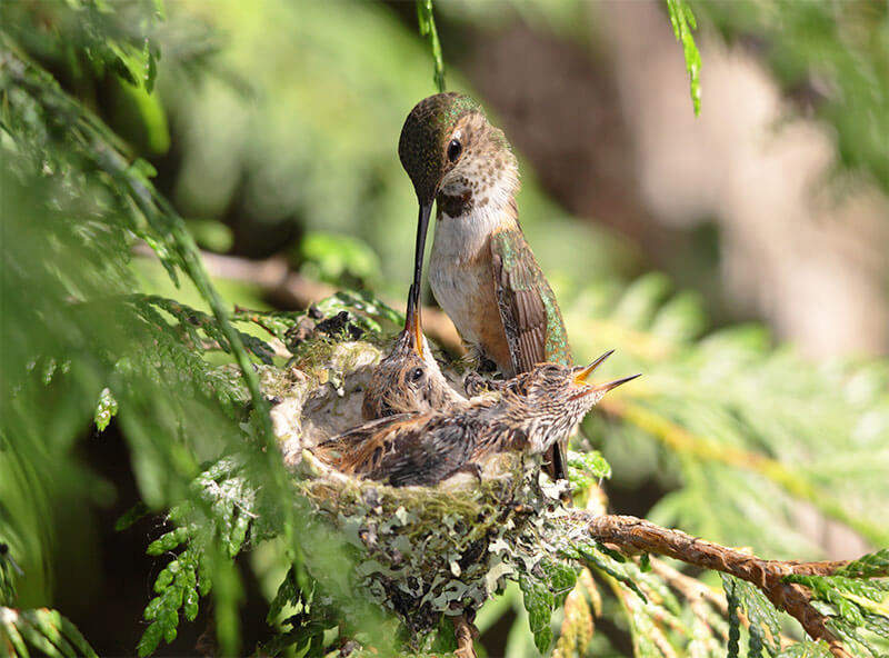 Hummingbird females are almost always larger than the males of their species, and almost always lay two eggs in a clutch. Most hummingbirds use spider silk in the nest, making it stretch as needed, from an incubator for the tiny eggs and a bassinet for the tiny hatchlings to a crib and even a big kid bed for the growing nestlings.
