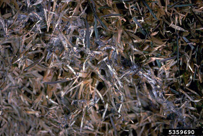 - Grass develops straw-yellow spots that look water-soaked. Morning light reveals cobweb-like growth.