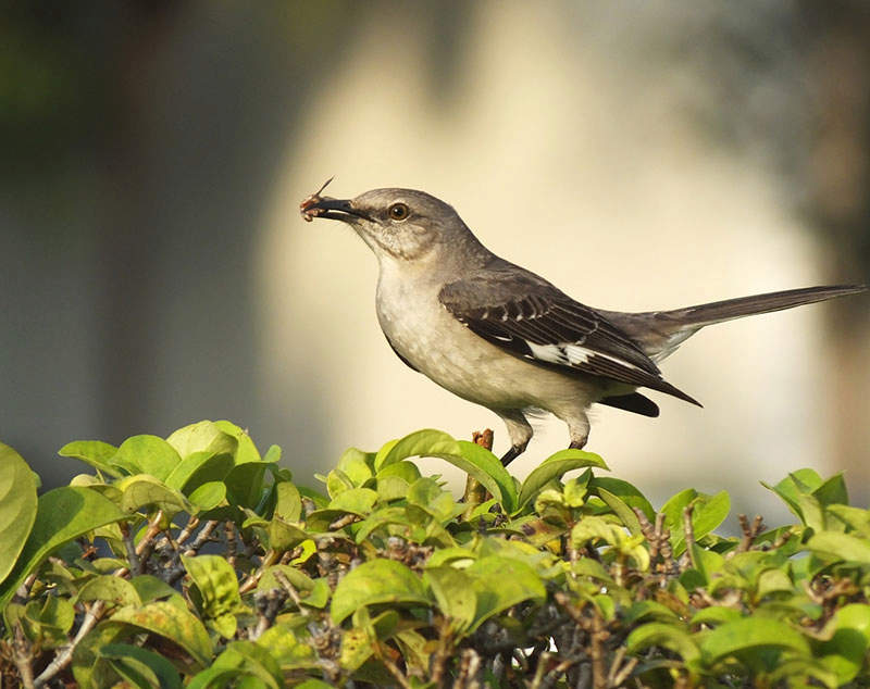 Mockingbirds eat lots of fruit, which they don’t like to share. Some chase away other fruit eaters, such as Cedar Waxwings, and have even been known to kill waxwings. Mockingbirds also require a lot of animal protein which they get from insects.