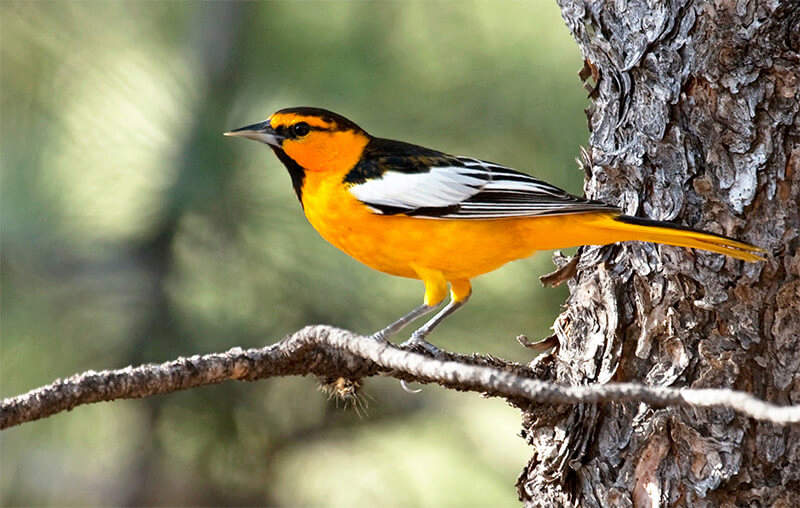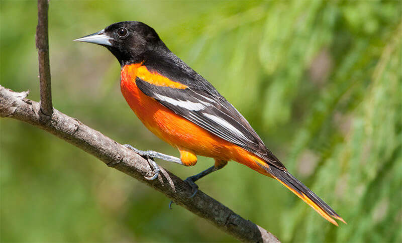 One or the other of these magnificent orange birds nests over most of North America, Baltimores in the East and Bullock’s in the West. The two species share many similarities—the males of both are a stunning orange, females more yellowish; both feed on a combination of insects, fruits, and nectar; both construct a dangling nest made of sturdy plant fibers; both tend to spend most of their time near the tops of trees, and the song of both is a richly tuneful whistle.