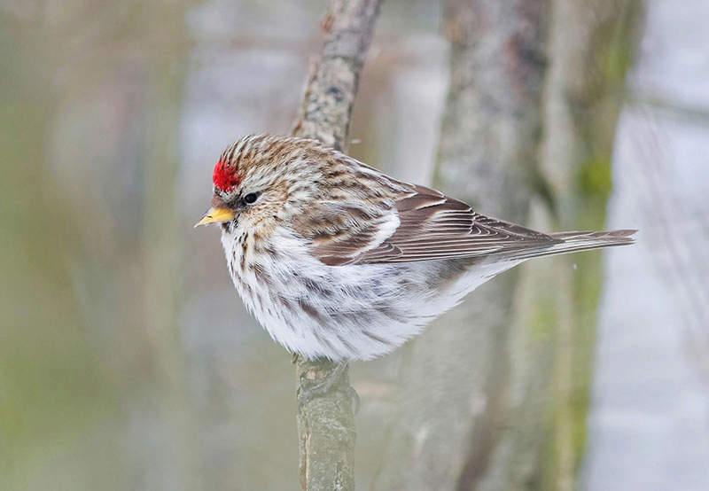 Redpolls are mostly grayish, covered with sparrow-like streaks, except for that forehead and the males’ pink or red breast color. They are just about exactly the size of Pine Siskins and American Goldfinches, and the three species can be found together in the same flocks. If you notice any pink or red at all, your tiny finch is a redpoll. If it has any yellow at all (except on the bill), it’s not a redpoll.