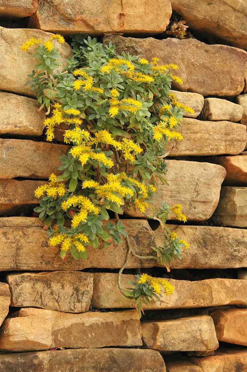 Succulents liven up retaining walls and other rocky fixtures by filling cracks with their beauty.